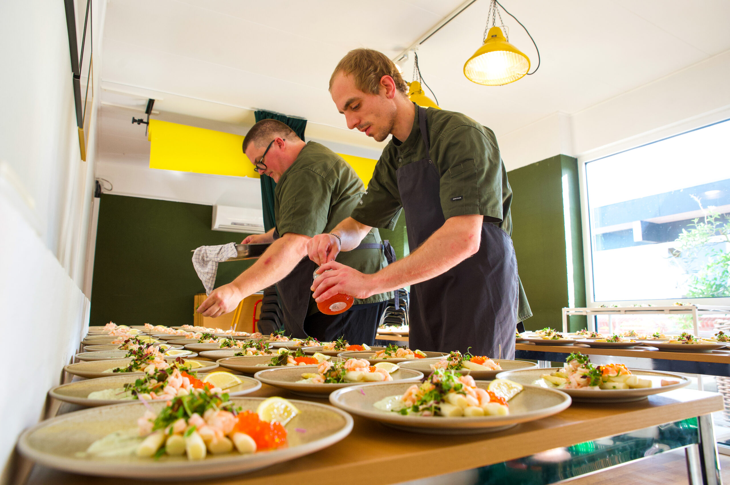 - Rejecocktail anrettet på salat, asparges, tomat, kaviar og hjemmelavet rød dressing. Hertil friskbagt brød samt smør